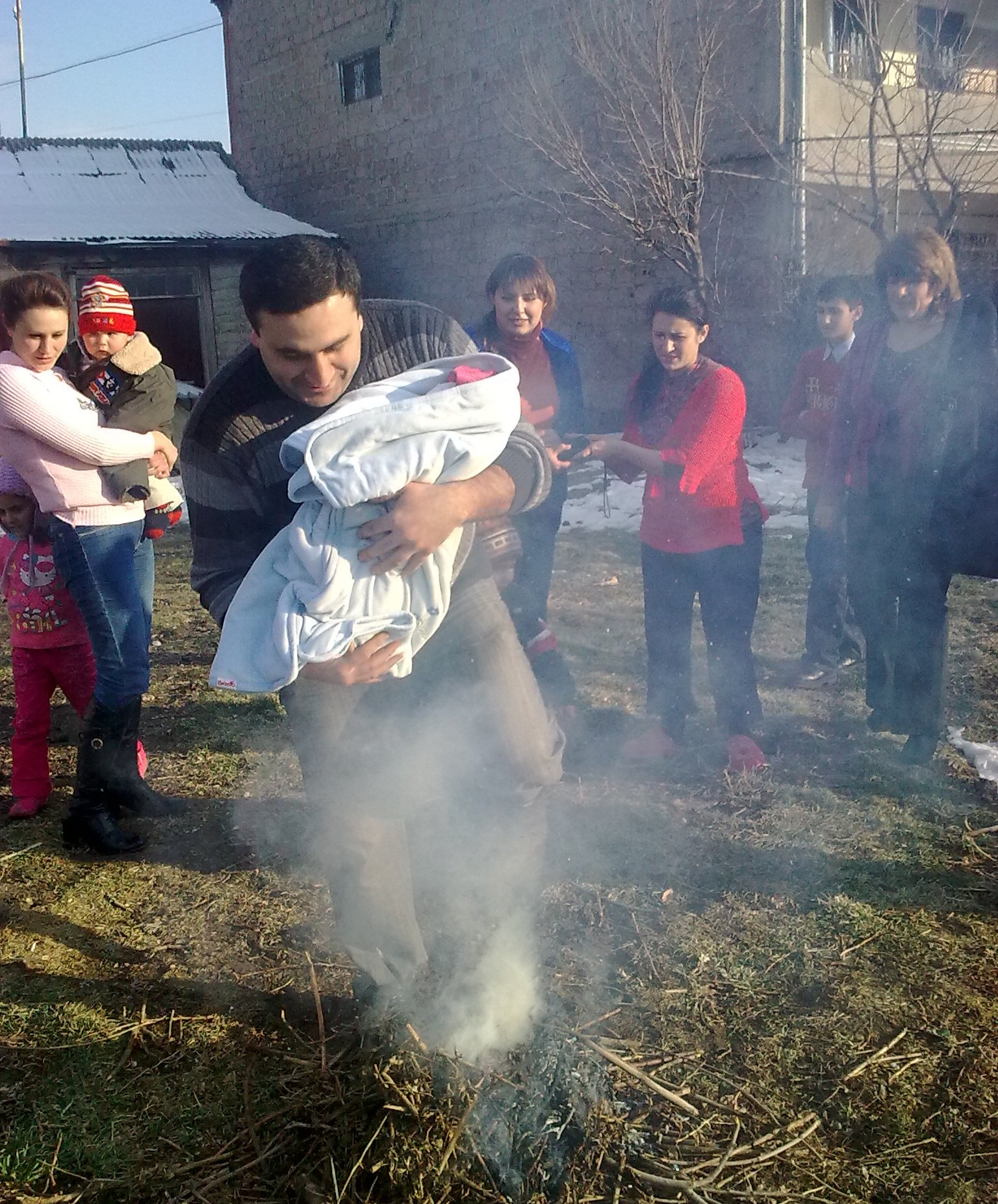 րենց մոմերը և տանում տուն: Եկեղեցական արարողությունից հետո, հինավուրց սովորության համաձայն, եկեղեցու բակում կրակ է վառվում: Երիտասարդները վառած մոմերով վերադառնում էին տուն, ուր նախապես արդեն պատրաստված կային փոքրիկ դեզեր, որոնք վառվում էին այդ մոմերով: Փոքրիկ դեզեր, առանց բացառության , պետք է լինեին յուրաքանչյուր տան տանիքի վրա, որպեսզի բախտը տան վրա լիներ: Վառած դեզի վրայով ցատկում էին: Երեկոյան արձակում էին հրացաններ: Խարույկի վրայից ցատկում էին, որպեսզի չվնասվեին գայլ ու գազանից, օձ ու կարիճից, հեռու լինեին ցավ ու չոռից: Խարույկի շուրջը նախ պտտվում էին նորապսակ զույգերը , իսկ կրակի վրայով առաջինը թռչում էր տան ամենատարեց կինը`մամիկը, որպեսզի իր տունը ազատի չարքերից , ապա սկսում էին թռչել երիտասարդներն ու երեխաները: Կրակի մոտ էին բերում նաև հիվանդներին: Եթե չամուսնացած աղջկա շորի ծայրը վառվում էր , ապա նա այդ տարի ամուսնանալու էր: Տրնդեզի կրակը իր հետ բերում էր օդի բարեխառնություն, հունձքի առատություն, արտերի բերրիություն և ամուսինների օրհնություն: